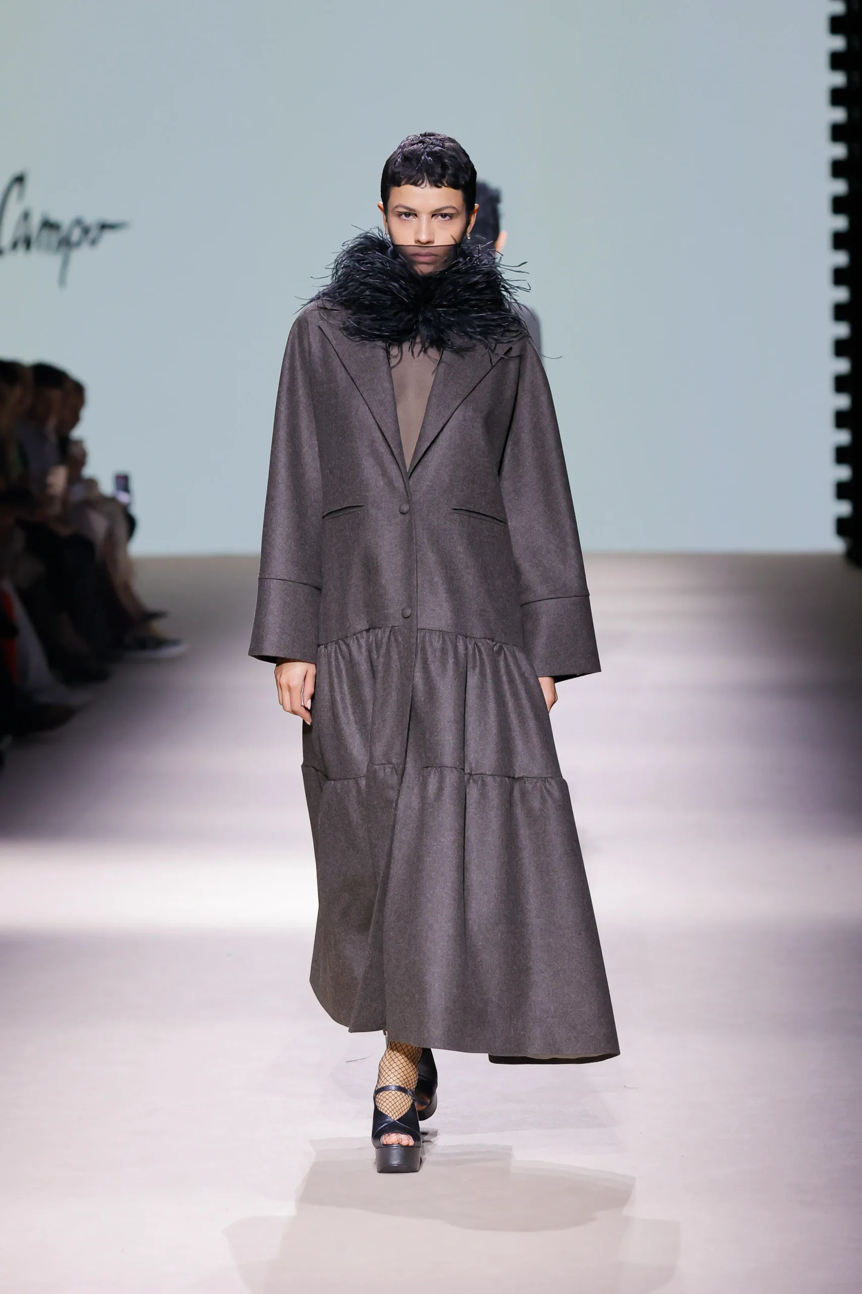 Abrigo de largo midi con silueta amplia y estructura relajada que envuelve el cuerpo con movimiento. El diseño incorpora un bajo fruncido que aporta volumen y dinamismo, rompiendo la rigidez de la prenda.