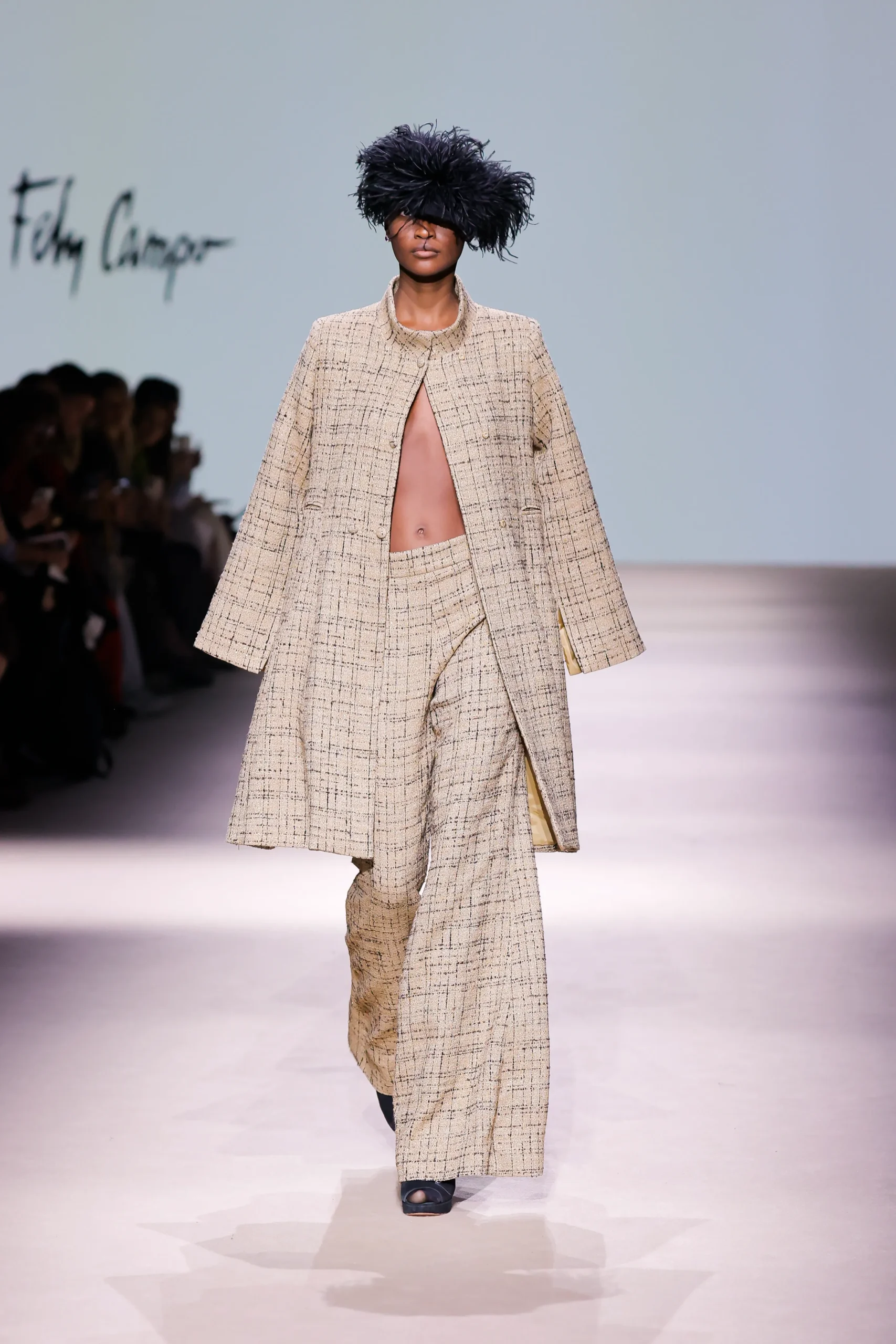 Conjunto de dos piezas en tweed beige con abrigo de silueta amplia y pantalón fluido.